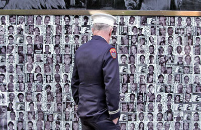 DE REGRESO. El ex capitán del escuadrón 52 de bomberos del Bronx, Jim McDermott, observa las fotos de las víctimas en uno de los murales de la Zona Cero. afp