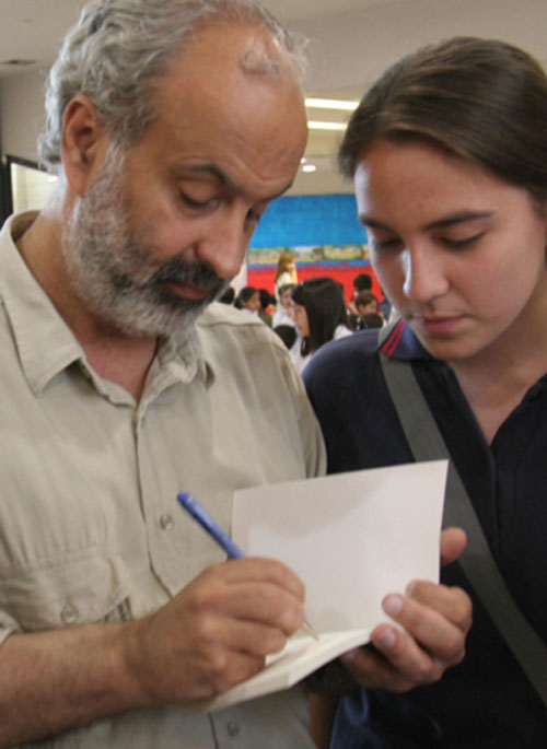 La historia de la novela “La soga”, que se vincula con la apropiación ilegal de bebés durante la última dictadura militar, mantuvo en vilo a Pablo y a sus compañeros, que la leyeron por sugerencia de la profesora de literatura Mariana Díaz. “Al curso le gustó mucho. Antes habíamos leído ‘Del amor y otros demonios’, que es una novela larga, pero esta nos ha resultado más atrapante”, afirmó el joven. Los fans que se acercaron a Valentino también elogiaron su novela “La buena sangre”, que es autobiográfica, según afirmó el autor.