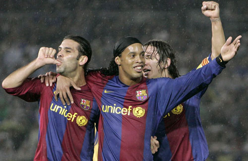 IMPARABLE. Márquez y Puyol festejan junto a Ronaldinho, la gran figura del match.(REUTER)