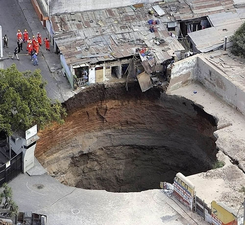 Al menos tres personas desaparecieron cuando repentinamente se abrió, en medio de la noche, este gigantesco pozo, en un barrio de ciudad de Guatemala. Varias casas fueron tragadas por la tierra. Desde hace varios días los vecinos venían denunciando que se oían retumbos subterráneos, pero nadie le había hecho caso.