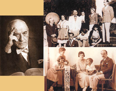 A LA DERECHA ARRIBA, ORTEGA, de perfil, CON ENRIQUE LARRETA (DE BLANCO), Máximo Etchecopar (sentado) y otros, en Buenos Aires, 1941. ABAJO, Ortega con su esposa e hijos.