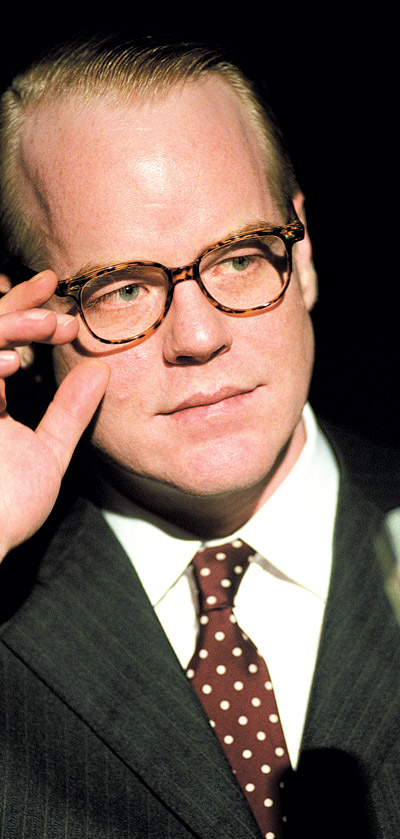 La escena muestra unas escalinatas colmadas de personas que esperan ver de cerca a los presuntos responsables de haber perpetrado un crimen múltiple, que acaban de ser capturados. Entre la multitud se puede ver a Truman Capote, quien ha concurrido al lugar con la intención de documentarse para escribir una serie de artículos sobre la masacre. El sonido ambiente va siendo paulatinamente reemplazado por un sostenido acorde musical pastoso y lejano, y los movimientos de los personajes se vuelven asordinados, como en un sueño. La toma se va cerrando lentamente sobre la imagen del escritor, que muestra una expresión congelada en una impresionante mezcla de interés, fascinación, atracción y horror, aunque el actor no mueve un solo músculo de su rostro. Este par de minutos tomados como muestra dentro del metraje que compone el excelente filme "Capote", dirigido por Bennet Miller, sirve para dar una idea de la enorme calidad del trabajo de Philip Seymour Hoffman en la piel del escritor norteamericano. Con gestos precisos y sutiles, e inflexiones de voz estudiadas casi como en una partitura musical, a Hoffman le alcanza con un par de escenas para pintar con trazo firme a Capote, y para mostrar sin exageraciones histriónicas todo el ingenio, el afeminamiento y la insolencia que caracterizaron al autor de "A sangre fría".