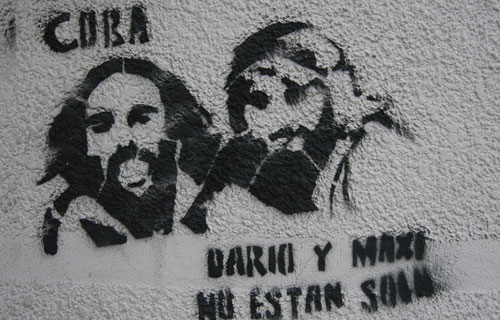 IMPLICANCIA POLITICA. Un stencil que alude a Maximiliano Kosteki y a Darío Santillán, en 25 de Mayo al 300. LA GACETA / INES QUINTEROS ORIO