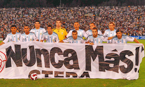 BANDERA DE NUNCA MAS. El equipo argentino posó para los fotógrafos portando una bandera que tenía la leyenda “Nunca más”, firmada por CTERA, en alusión a la muerte del docente Carlos Fuentealba.