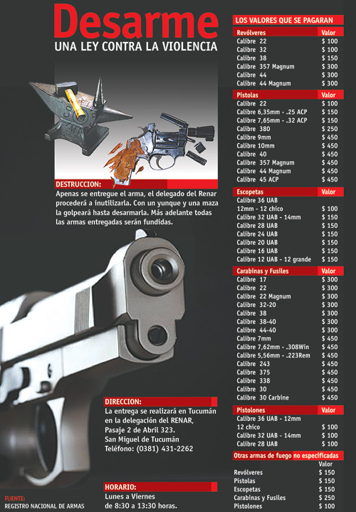 En la Argentina, la segunda causa de muerte son las armas de fuego. Con esta premisa, el Gobierno Nacional pondrá en marcha mañana el programa voluntario de desarme, con el cual pretende bajar los índices delictivos en el país. El plan consiste básicamente en la entrega de armas a cambio de dinero.