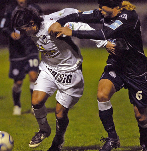 CUERPO A CUERPO. Daniel Vega, autor del gol de Platense, intenta escapar de la marca de Federico Pomba. TELAM CUERPO A CUERPO. Daniel Vega, autor del gol de Platense, intenta escapar de la marca de Federico Pomba. TELAM