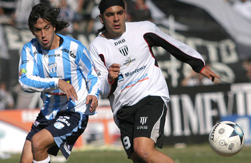 LEJOS DE LA PELOTA. Erroz y Alvarez intentan ganar la posición.GENTILEZA DIARIO “LOS ANDES” DE MENDOZA