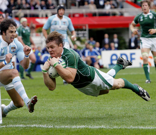 LA PRIMERA CAIDA. El capitán irlandés Brian O’Driscoll logra vulnerar el in-goal argentino, luego de 272 minutos.REUTERS