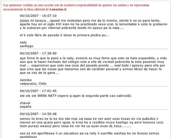 De hecho, hoy la expresión "wena Naty" (con la que la alentaba el amigo voyeur) acapara Google. Además, la red está atiborrada de páginas que cuentan las peripecias de la estudiante y de links que ofrecen la posibilidad de ver sus videos de una forma alternativa. Ni hablar de los ardientes foros donde cientos de ignotos opinan sobre la moral, el sexo precoz, la hipersexualización como un medio para alcanzar la fama, los prejuicios y los juegos hot de los adolescentes.