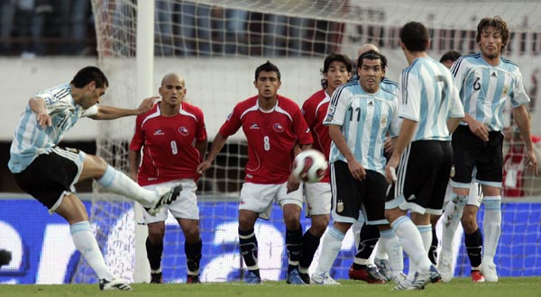 A los 26 y a los 44 minutos del primer tiempo, el número 10 de la Selección marcó dos tantos espectaculares de tiro libre. Fue el primer partido por las eliminatorias para el Mundial de Sudáfrica 2010. Chile, dirigido por Marcelo Bielsa, sufrió una expulsión en el complemento.