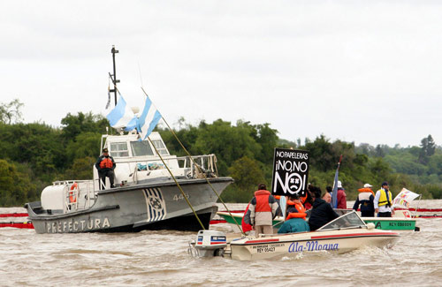 Esta medida fue reseñada por uno de los referentes del movimiento entrerriano, José Pouler, que también dio cuenta del Plan de Vigilancia Ambiental que se puso en marcha en Gualeguaychú con especialistas locales, provinciales y nacionales. Los preparativos del escrache, previsto para el mediodía en la sede diplomática de Las Heras y Junín, se produjeron al mismo tiempo que las chimeneas de Botnia emanaban humos negros y blancos, además del olor a coliflor hervido en sus adyacencias.