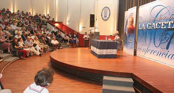 En una disertación que fue auspiciada por el Banco Santiago del Estero (BSE), Aguinis habló ante una multitud en el Centro Cultural Eugenio Virla, y fue presentado por el doctor Carlos Páez de la Torre (h).