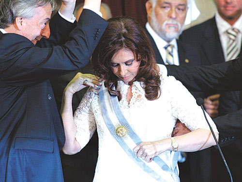 Así como el ya ex presidente Néstor Kirchner dio que hablar por su estilo de vestir informal y desprolijo, su esposa, la ahora presidenta de la Argentina, Cristina Fernández, le puso un fuerte toque de glamour a la ceremonia de asunción, en el Congreso de la Nación. Poco después de las 15, la presidenta ingresó con un tapadito de encaje color manteca con mangas tres cuarto debajo del cual se veía un vestido al tono de líneas simples, con el ruedo apenas cubriendo las rodillas, y zapatos con taco stiletto. Llevaba el pelo suelto, alhajas de oro (una cadenita, aros y reloj) y el maquillaje que la caracteriza, con las pestañas cargadas de rimmel y labios pintados en tonalidad frambuesa.
