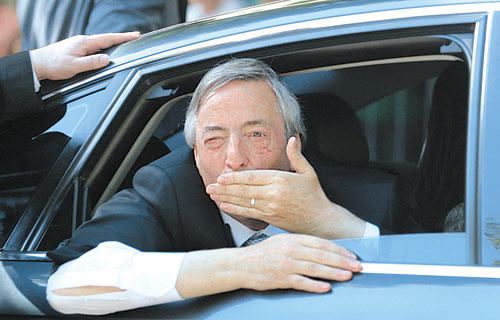 Kirchner reconoció su dificultad en seguir las reglas del protocolo, cuando la Presidenta le hizo notar que primero era necesario firmar antes de recibir los atributos del mando. El jefe de Estado en el período 2003-2007 aprovechó el trayecto entre el Congreso y la Casa de Gobierno para saludar a la multitud que se agolpaba detrás de las vallas, a lo largo de avenida de Mayo. Con las ventanillas del auto bajas, Kirchner no paró de saludar a la gente, mientras Cristina hacía lo propio desde el otro lado del vehículo.