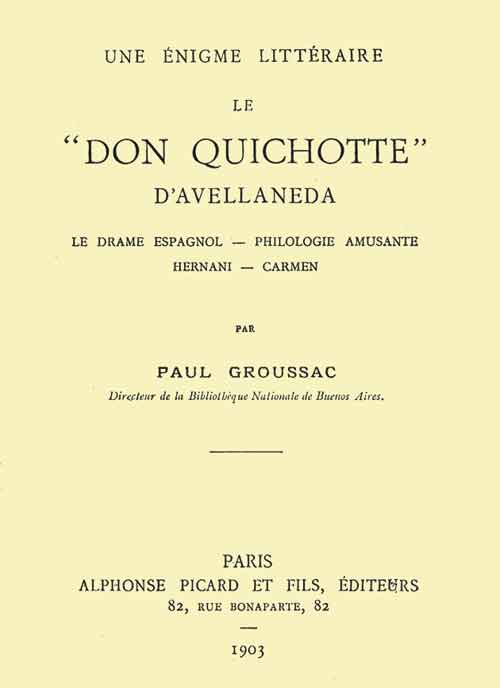 Vale la pena recordar que el ensayo central de esa obra, titulado Le Don Quichotte d?Avellaneda, tiene bastante más miga que arriesgar una hipótesis sobre la verdadera identidad de aquel Alonso Fernández de Avellaneda, que publicó, en 1614, una apócrifa segunda parte del Quijote de Cervantes. Es un estudio cargado de interés sobre el famoso libro. Si bien su autor declaraba, en el prefacio, que no entendía renovar, con su trabajo, "la bibliografía y la crítica" de Cervantes, sí opinaba que era una demostración de que esa biografía y esa crítica necesitaban una renovación.Además, ese tomo compila, bajo el título de Le drame espagnol, artículos de Groussac aparecidos en 1898, en Le Journal des Débats. Asimismo, titulada Philologie amusante, está su carta polémica del mismo año dirigida al crítico Francisque Sarcey. En ella, a propósito de la palabra scalabreux, Groussac hacía notar la necesidad de que los franceses dejaran de lado, de una vez por todas, su orgullosa indiferencia hacia las lenguas extranjeras, en especial el castellano. También trae un escrito juvenil sobre Carmen, de Merimée. Todo esto jamás tuvo versión española. Unicamente el estudio titulado Hernani, que apareció en La Nación, obviamente en castellano, en 1886.
