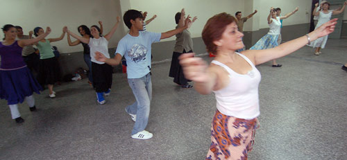 Mery Moreno Medina hace tres años que toma clases de folclore: “Disfruto de bailar y esta danza me gusta particularmente porque es nuestra”, dice. La música está fuerte y las caras sonrientes; se ven pañuelos en el aire y anchas polleras que giran sobre el suelo. “Así es la clase del profesor Nicolás Brizuela. Llena de buena onda, de rostros alegres y coreografías hermosas”, destaca Mercedes Herrera de 64 años. “Vengo a hacer gimnasia porque es la única actividad que tengo. Soy ama de casa y me gusta el folclore. Siempre tomo cursos y cuando puedo participo de presentaciones. Me siento cómoda porque no se necesita un cuerpo esbelto o joven. Todos pueden ponerla en práctica”, cuenta Mercedes.