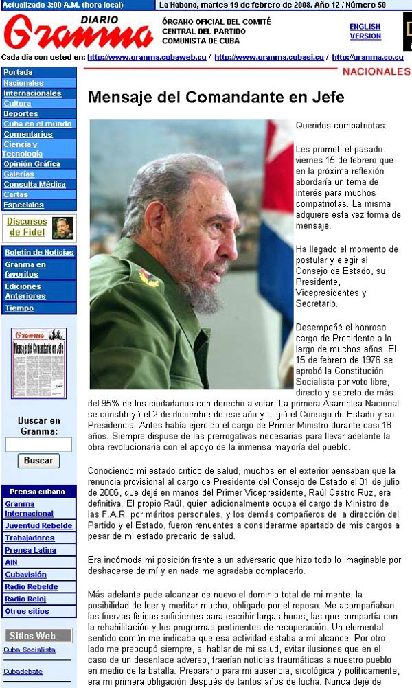 Castro reconoció no estar en condiciones físicas de volver a ser presidente, aunque aclaró que goza de un dominio total de sus facultades mentales. Su sucesor será anunciado el domingo, cuando el Parlamento cubano se reuna para renovar al Consejo de Estado.