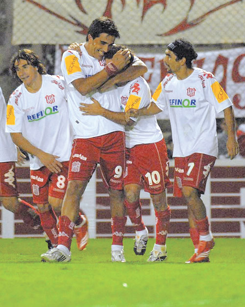 EUFORIA EN CORDOBA. En el medio del festejo está Campodónico, autor del gol del triunfo sobre Instituto. LA GACETA / ENVIADO ESPECIAL JORGE OLMOS SGROSSO