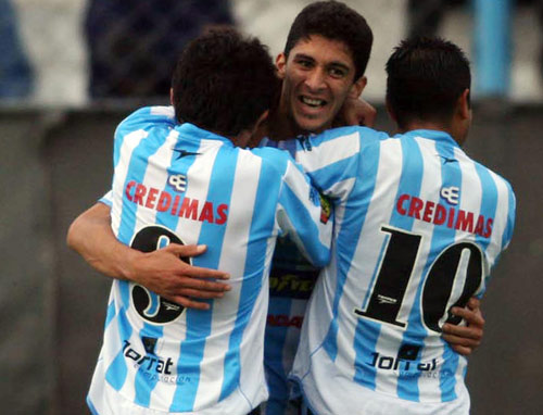 JUBILO. Hernández, autor de los dos goles de Atlético, se abraza con Sarría y el “Pulguita” Rodríguez. Los “decanos” están al tope de las posiciones. LA GACETA / FRANCO VERA ENVIADO ESPECIAL
