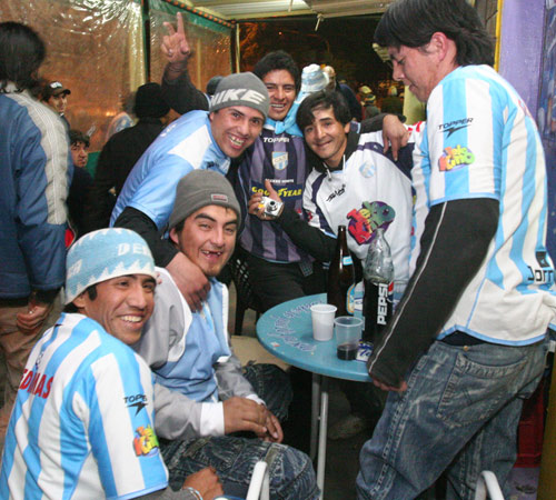 Los hinchas comenzaron a impacientarse cuando se hicieron las 20.30, hora señalada para el inicio del encuentro, y la señal de TV no llegaba desde Córdoba. Para calmar las ansias todos comenzaron a cantar. "El que no salta, no va a la ?B?..." fue el estribillo preferido a la hora de gritar.