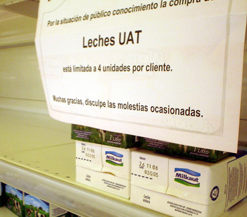 "Sólo se venderán hasta dos unidades de leches refrigeradas por persona", indicaba un cartel. Otro letrero, que estaba más adelante en la misma góndola, rezaba: "el yogur es sólo para consumo familiar".
