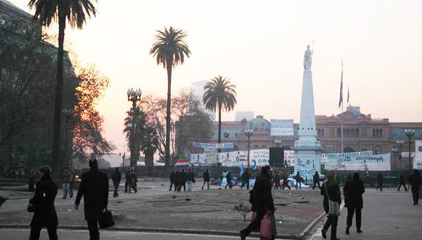 Desde temprano, grupos de manifestantes colgaron pancartas, pasacalles y banderas en Plaza de Mayo, con de consignas en apoyo a la jefa de Estado y al ex presidente. Delante de las vallas de seguridad se veía el precinto del área donde sufrió un accidente fatal el manifestante tucumano Carlos Marreira, a quien se le cayó una tulipa en la cabeza desde siete metros de altura.