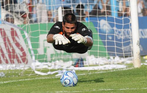 VUELO A LA GLORIA. Emanuel Trípodi está a punto de agarrar la pelota después de haberle atajado el penal que ejecutó “El Pulguita” Rodríguez. LA GACETA/ HECTOR PERALTA