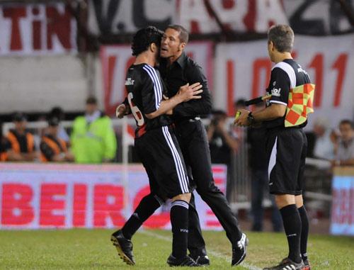 GOL CON DEDICATORIA. Tras conquistar el tanto que le dio la igualdad al “millonario”, Eduardo Tuzzio se fue a festejarlo con el renunciante Simeone. FOTOBAIRES