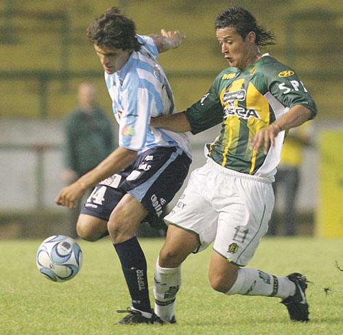 marca a presion. César Montiglio, que en el segundo tiempo reemplazó a Castro, frena un avance encabezado por Sergio Esteche. FOTOBAIRES