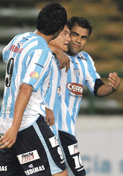EL EQUIPO TIENE GOL. Sarría anotó de penal. El artillero del equipo festejó con sus socios: “Pulguita” y Gutiérrez. FOTOBAIRES