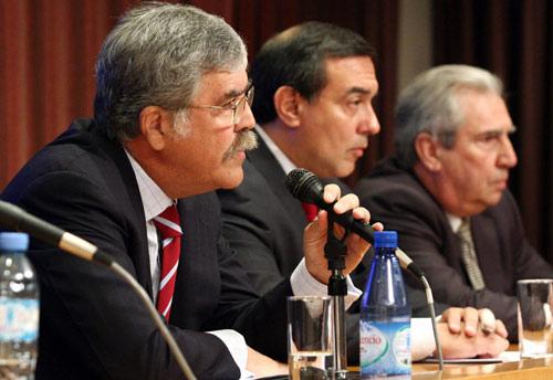 ANUNCIO. El ministro De Vido fue el encargado de comunicar la decisión oficial. Al fondo de la imagen, el interventor Roberto Darío Pons. NA