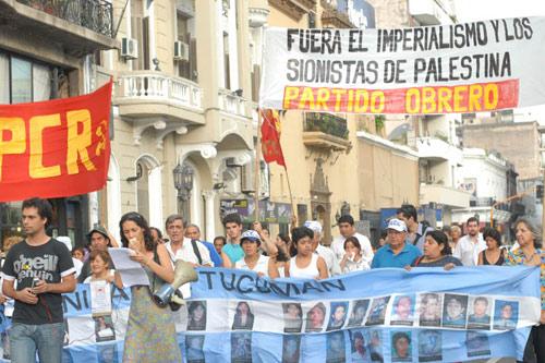 Los militantes se autoconvocaron en el principal paseo público y coincidieron con la marcha número 149 que, desde hace un año y medio realiza los martes Alberto Lebbos, en reclamo de justicia por el crimen de su hija, Paulina. “Como los sionistas matan a los palestinos con bombas en Tucumán, el gobierno de (José) Alperovich lo hace con impunidad y hambre”, dijo Lebbos. Tras una vuelta alrededor de la plaza, se realizó un acto con oradores frente a la Casa de Gobierno. “Repudiamos la masacre del Estado terrorista de Israel; la única solución es la destrucción del Estado terrorista y la instalación de un Estado único y laico”, sostuvo Juan Luis Véliz, del PTS.