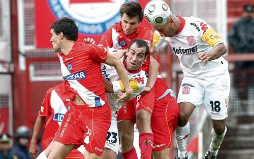 TODOS ARRIBA. Entre la maraña de cabezas, Matías Villavicencio se las arregla para conectar el cabezazo. Hubo intermitencias en el rendimiento defensivo de los “santos”. FOTOBAIRES