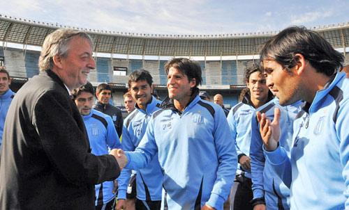 Dos televisores plasma de pantalla de LCD para los jugadores de Racing prometió el ex presidente Kirchner si el equipo de sus amores le gana a Boca Juniors en el partido que disputarán la próxima fecha del torneo Clausura local. Kirchner visitó ayer al plantel de la Academia (foto) y habló con el técnico Ricardo Caruso Lombardi, y los jugadores. El ex mandatario copió así el método que suele usar el entrenador, que promete premios antes de los partidos.