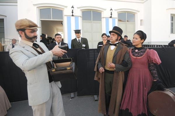 Pintoresco espectaculo.- Los invitados a la estación Central Córdoba fueron recibidos por cinco actores que, vestidos a la usanza del siglo pasado, rememoraron los inicios del ferrocarril (foto). Algunos vecinos se tomaron fotografías con ellos.