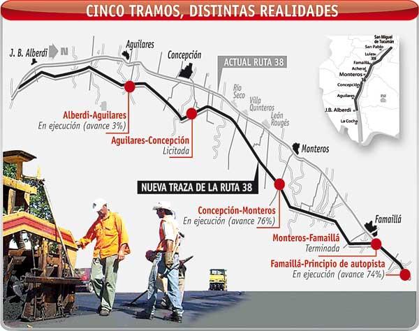 En total, la inversión para los 95 kilómetros del proyecto asciende a casi $ 633 millones, de los cuales se van ejecutando trabajos por unos $ 332 millones. Es decir, el grado de avance general del trazado es de un 53%. Actualmente, está en ejecución la calzada que unirá Concepción con Monteros (24 kilómetros de longitud que, según las previsiones oficiales, se inaugurarán en julio de 2010), y hace dos meses comenzaron las obras para trazar la ruta entre Alberdi y Aguilares (20 kilómetros que podrían concluirse en diciembre de 2011).