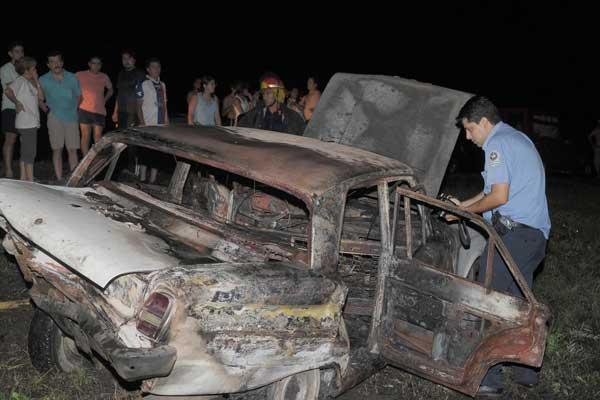 El impacto fue tan fuerte que el Falcon se salió del camino y derrapó casi 80 metros hacia la banquina oeste. Aparentemente, como producto del choque, el tanque de nafta del Ford se rompió y el combustible se esparció por todo el vehículo. Rápidamente, el automóvil se convirtió en una bola de fuego, afirmaron testigos. "Yo me acerqué para intentar ayudar, pero tuve miedo de que tanque explote y me alejé un poco. Colaboré con lo que pude; esa pobre gente salía como podía del auto. Yo llamé dos veces al teléfono de la Policía", señaló Rodrigo Robles.