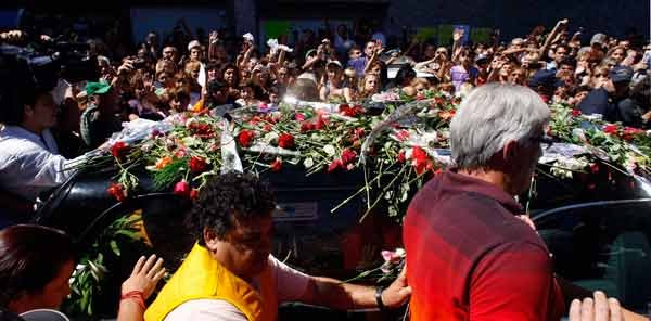 Una lluvia de flores, en medio de aplausos y un dolor generalizado, caracterizó el paso de la caravana, que transitó más de una treintena de kilómetros con miles de personas apostadas a ambos lados del camino.