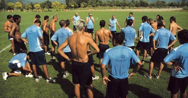 RENDIDOS A SUS PIES. De Santis explica los ejercicios y los jugadores prestan atención. "Chiche" Sosa, con lentes de sol, escucha al preparador físico. El plantel continúa la puesta a punto. ROLANDO DIAZ - ESPECIAL PARA LA GACETA