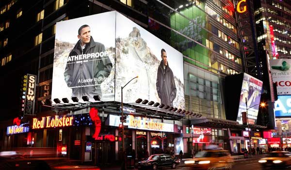 La firma Weatherproof descubrió la fotografía en plena avenida Times Square, cuando el mandatario estuvo en la Gran Muralla China, lugar que visitó vistiendo una de sus camperas.