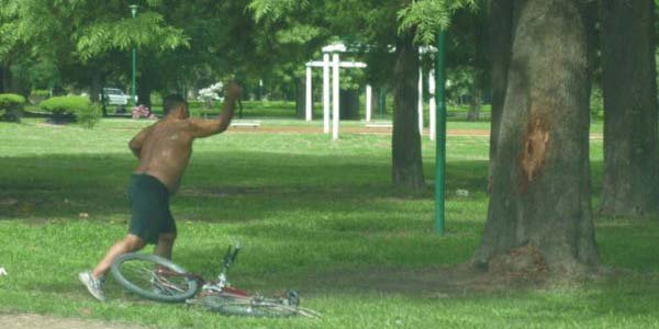 Este hombre aparece todas las tardes en avenida Soldatti al 600 y se para frente a ese árbol. Eleva el brazo y, con fuerza, descarga el cuchillo contra el corazón del ejemplar, que está visiblemente dañado. La imagen fue enviada por un lector, que reflexionó: "el vandalismo no es exclusividad de los jóvenes, como se pregona. Debemos redoblar los esfuerzos puestos en la educación".