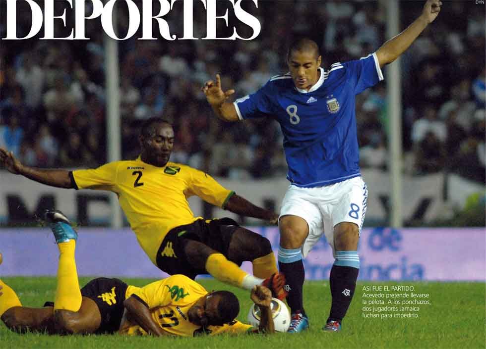 ASI FUE EL PARTIDO. Acevedo pretende llevarse la pelota. A los ponchazos, dos jugadores Jamaica luchan para impedirlo.