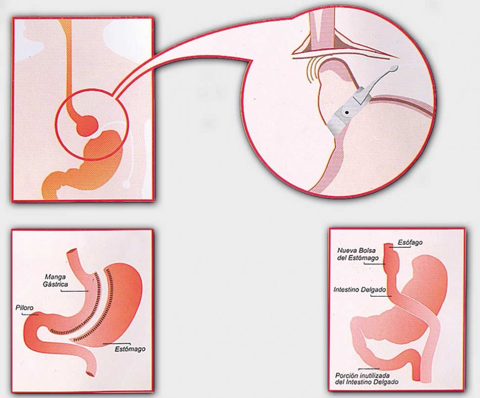 "La cirugía bariátrica tiene dos componentes: uno restrictivo, que consiste en achicar el tamaño del estómago (cuya capacidad es de 2.500 mililitros) y dejar una bolsita pequeña para que reciba el alimento. El segundo componente es el malabsortivo: se corta 1,5 metro del intestino delgado -que mide de 4,5 a 6, 5 metros- para reducir la absorción de los alimentos y se lo une al estómago pequeño. El estómago grande queda abandonado; al no recibir alimento se contraerá pero seguirá secretando moco o jugo gástrico y este caerá directamente en el intestino delgado. Ambas técnicas -restrictiva y malabsortiva- se las puede usar por separado o bien en forma mixta", explicaron los médicos