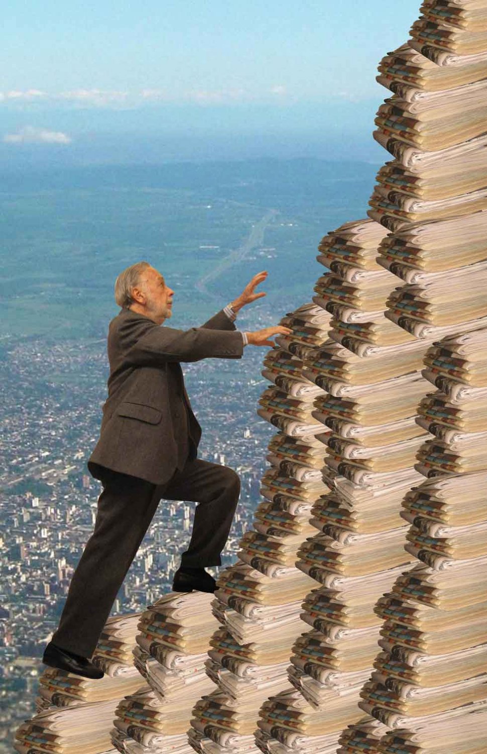 Daniel Alberto Dessein escalando una torre de ejemplares de La Gaceta Literaria, con Tucumán de fondo. Fotocomposición de Lucrecia Aráoz.