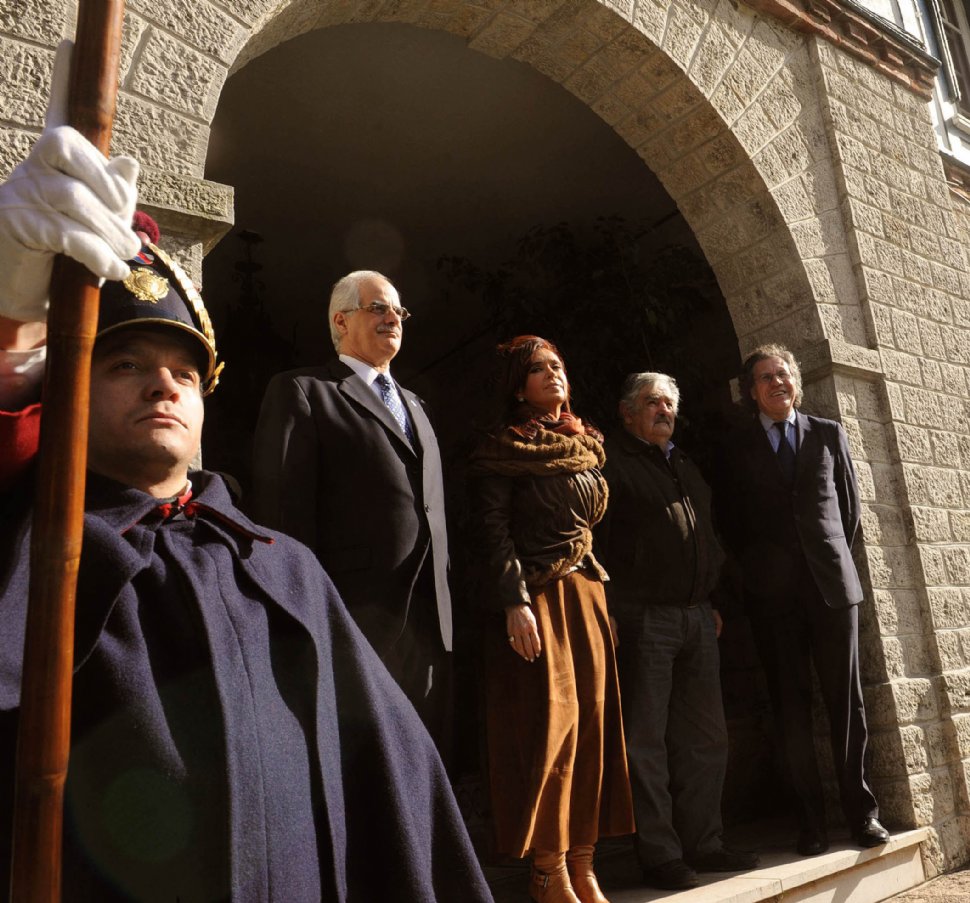 EN ANCHORENA. Los presidentes Fernández y Mujica y sus cancilleres recibieron un saludo de honor de la fuerza militar uruguaya.