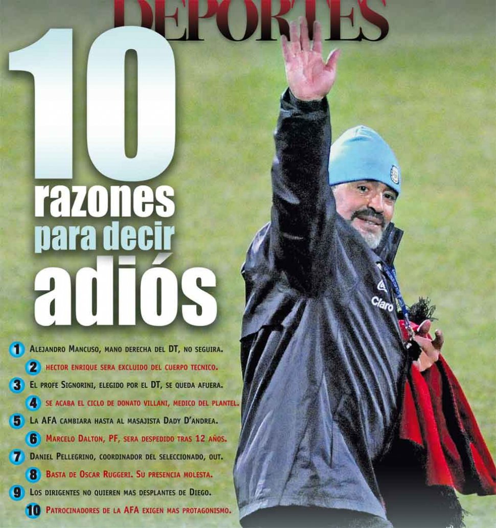 Atrapado y sin salida quedó Diego Maradona luego de la reunión con Julio Grondona. El presidente de la AFA le ofreció seguir siendo el entrenador de la Selección, pero le puso condicionamientos difíciles de aceptar: renovar todo el cuerpo técnico. "Si me tocan al utilero, me voy", había advertido horas antes. El ciclo parece llegar a su fin. Hoy se hará el anuncio oficial