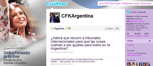 NUEVA YORK, Estados Unidos.- La presidenta Cristina Fernández de Kirchner criticó un fallo judicial a favor de la compañía Fibertel, del multimedios Clarín. "Habrá que recurrir a tribunales internacionales para que las cosas vuelvan a ser iguales para todos en la Argentina", expresó anoche en su Twitter.
