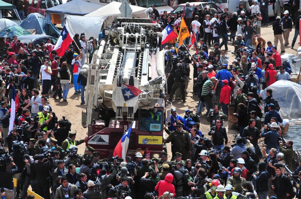 LA T130 FUE RETIRADA EN MEDIO DE APLAUSOS.- La máquina perforadora T-130 que permitió llegar hasta el lugar donde están los 33 mineros fue retirada de la mina en medio de aplausos, tras culminar el sábado con éxito la perforación de los 622 metros del ductos de 65 centímetros. Construida en Estados Unidos -pertenece a la empresa chilena Geotec-, empezó su tarea el 7 de septiembre y nueve días después perforó el ducto de 25 centímetros que llegó al refugio de los mineros y constató que estaban con vida.
