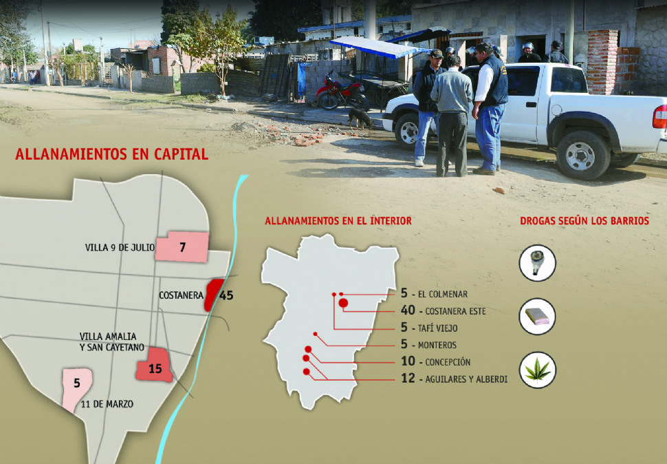 En la mayoría de los casos, son casas humildes en las que funcionan pequeños negocios de venta de drogas. Hace unos meses, el "paco" transformó a la Costanera en el epicentro de los operativos antinarcóticos de la Policía. Pero este año, los procedimientos de la Dirección General de Drogas Peligrosas (Digedrop) crecieron un 40% y se extendieron por toda la provincia. Los allanamientos abarcaron distintos barrios de la capital y ciudades del interior. La Policía afirma que los operativos en la Costanera produjeron la migración de dealers al interior. Pero los barrios ubicados a la vera del río Salí siguen siendo las más críticos de la provincia. Allí se realizó el 50% de los allanamientos.