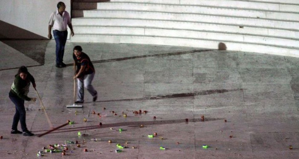 UN PAPELON. La pista del escenario quedó regada de objetos arrojados por el público. FOTO TOMADA DE LOSANDES.COM.AR